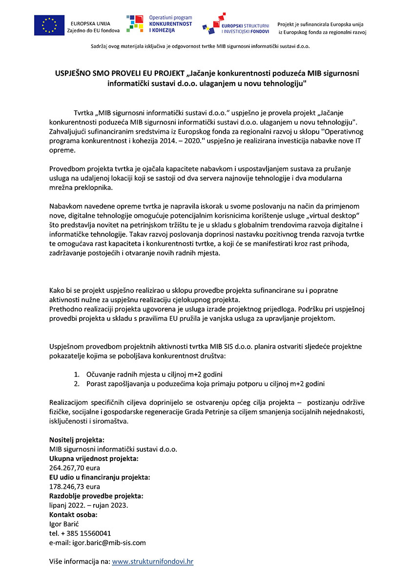 Cilj projekta: omogućiti uvjete i pretpostavke za rast kapaciteta i konkurentnosti tvrtke MIB SIS d.o.o. putem ulaganja u nabavku softvera i hardvera za uspostavljanje usluge „virtual desktop“, a što će omogućiti odgovor na stvarne potrebe tržišta te potpuno iskorištavanje ekonomskog potencijala tvrtke uz značajan utjecaj na socio-ekonomsku sliku poduzetništva te povećanje kvalitete života na širem petrinjskom području.